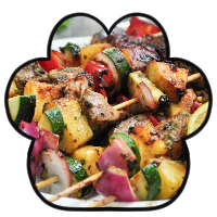 Five skewers of tuna chunks, mushrooms, tomato, zucchini, pineapple, bell pepper, and onion that have been kissed by the grill and embraced in flames with a sprinkling of lemon pepper for that extra zest in that slightly charred perfection.